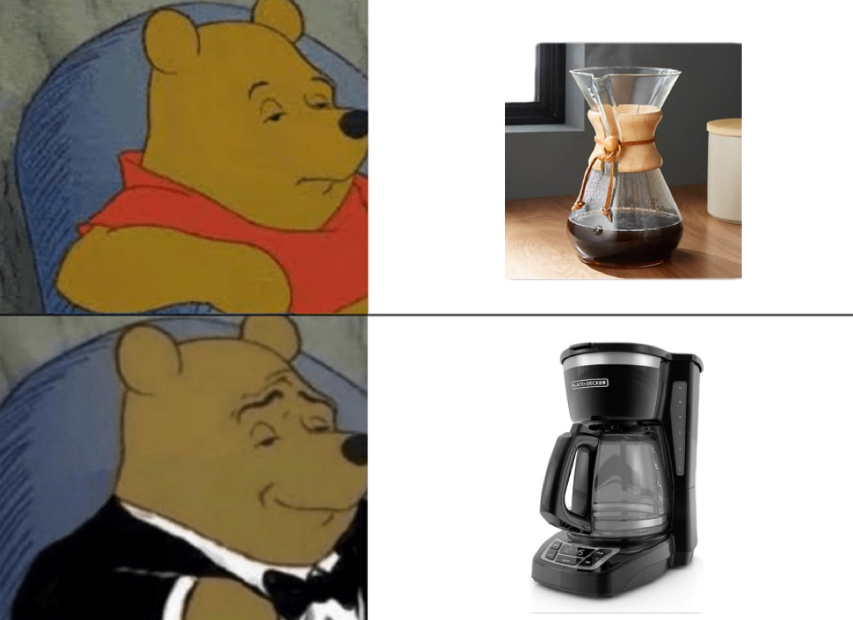 Like most of my ideas, they come to me while I am running, and my 10 & 2 theory is no different. A vast majority of these ideas begin as a joke but slowly take form into something of substance. In this instance, I remember the run clearly. It was a long run with my friend Taylor on a popular loop here in Austin known as Great Northern. Taylor, like myself, is an aspiring amateur home barista – i.e., we own a Chemex and grind our own beans. During the run, Taylor was regaling me with the news of his recent purchase of an espresso machine and how he wants to get experimental. I obviously scoffed at him, as is my wont, and then boasted about how my palate is now so refined that only gas station coffee will do. I continued to say that if the hands of a clock represented our expertise in coffee (1:00 being a beginner and 11:00 high level expertise), the hour hand for me would be firmly at 10:00. Meaning, that although I have a high level of expertise, the hour hand is technically now closer to that of a beginner (2:00) than when I was deep in the trenches of my coffee obsession (6:00). And this is the seed of my idea: whenever you approach expertise in a hobby or pursuit, you find your tastes or preferences within such a lane you begin to revert to that of a beginner. The best way to explain this theory is the Sophisticated Winnie the Pooh meme.